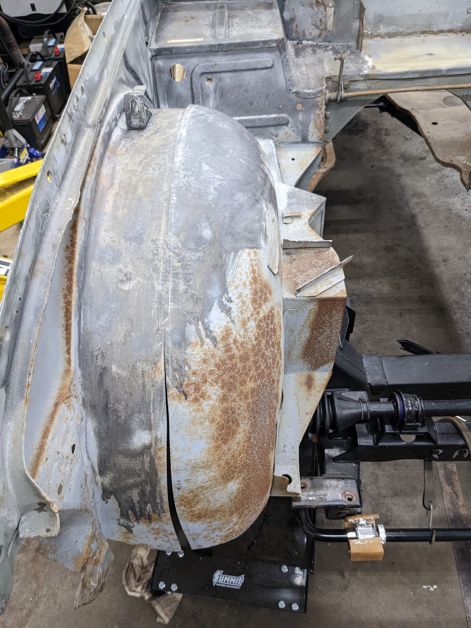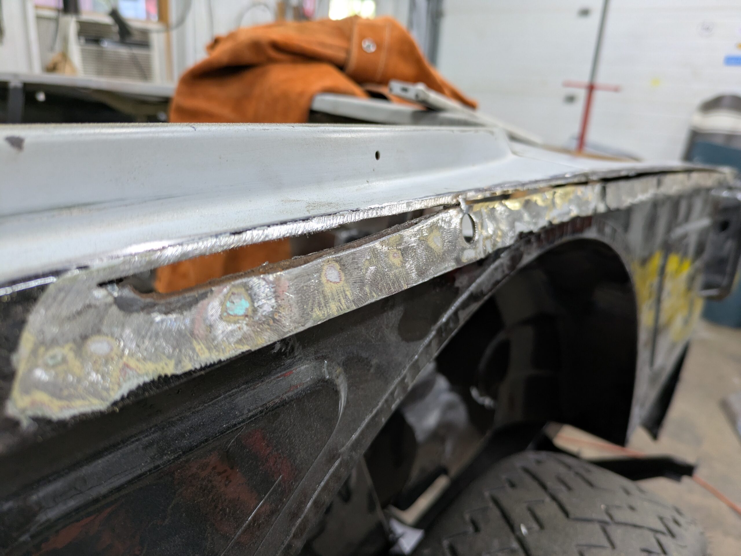 October-2025 – Back in March, 2025 I offered up the left rear fender found a problem. The flange that forms the inner fender was reworked and they didn’t get the bits lined up properly. The body line was 1/2″ too high at its highest point. Racing season was here, so I packed up the project and rolled it out of the way. After thinking about the problem during racing season and speaking to a friend with real bodywork skills about how to proceed, in October 2025 I decided to take a cut off wheel and slice out of the flange what needed to go, clamp down the inner fender to close the gap I just made and tack it down. Then refit the fender, see where I was, and repeat until I got the inner fender down to where it needed to be. While I was able to get the fender alignment pretty good, the very front of the fender is now a bit proud of the inner fender, see the last picture in this gallery.