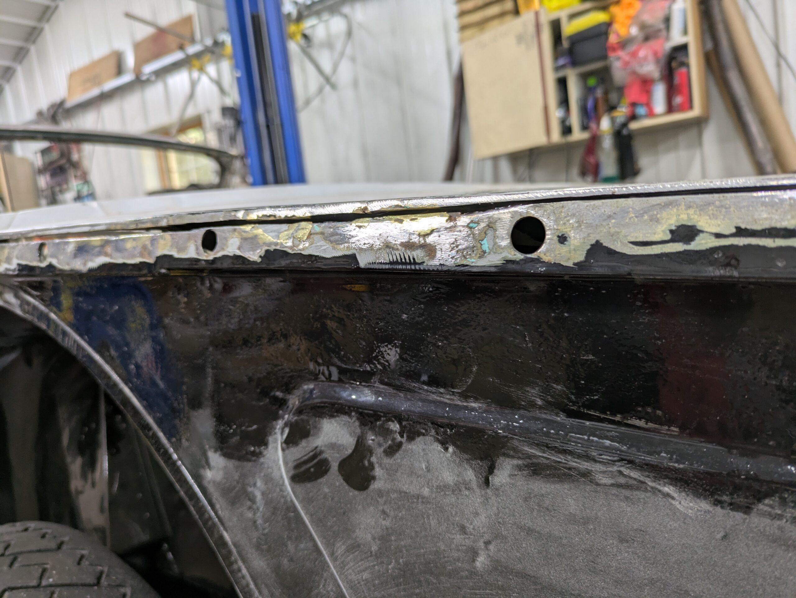 Getting the tub ready for paint – A couple of smallish holes in the sills, a little cleanup on a patch in the drivers footwell, should not be all the involved, right? Work done February-March, 2025.
