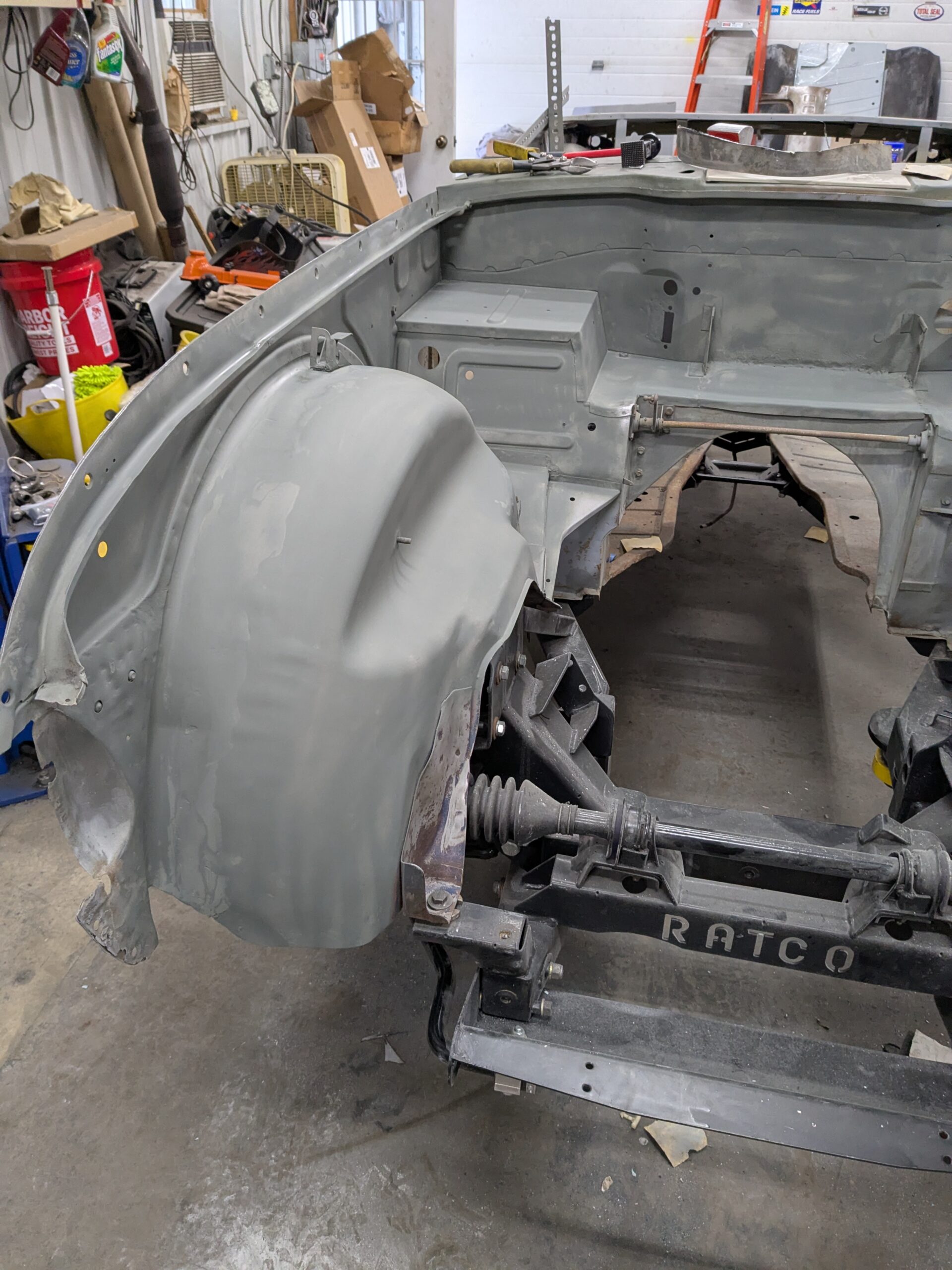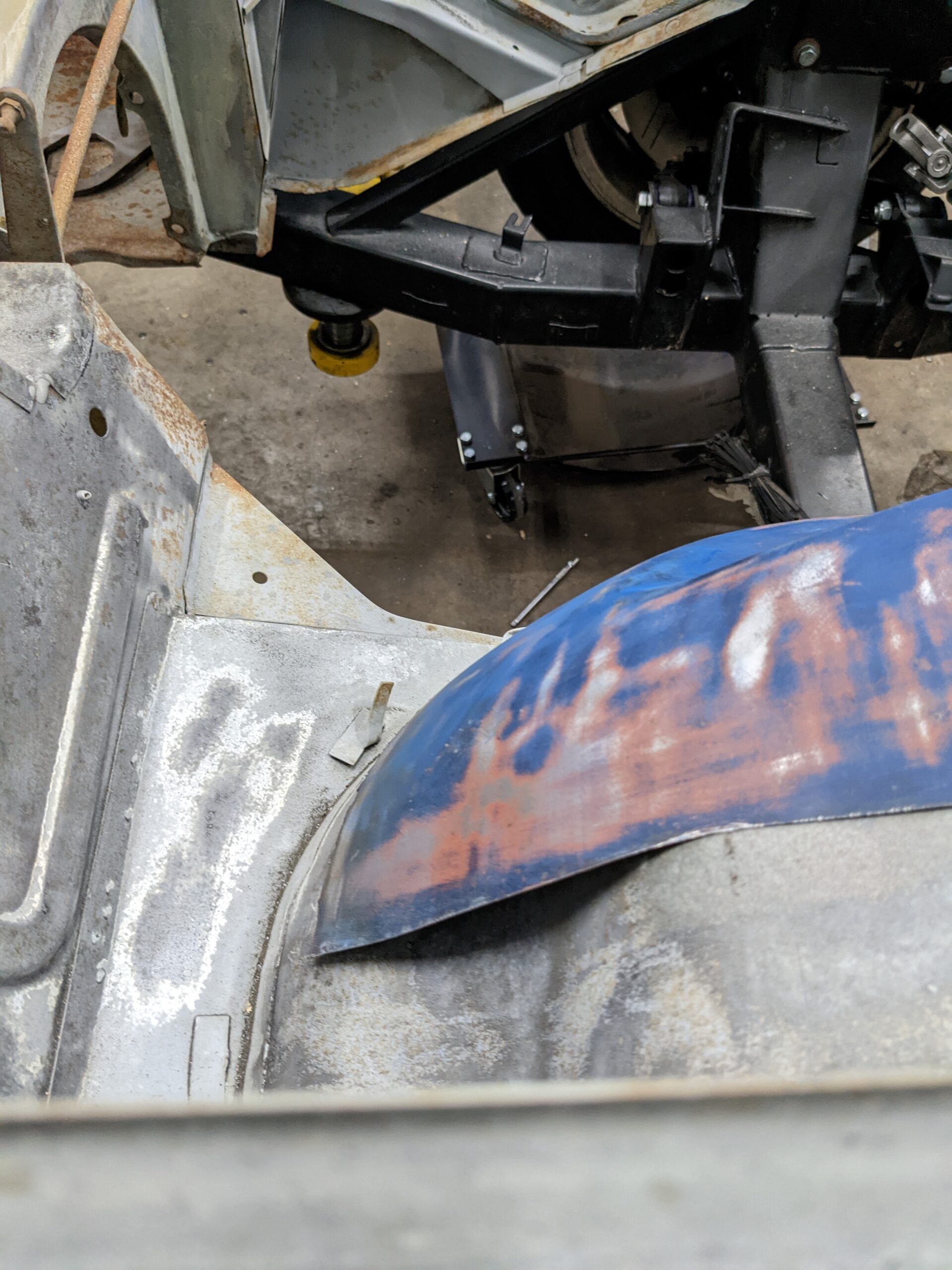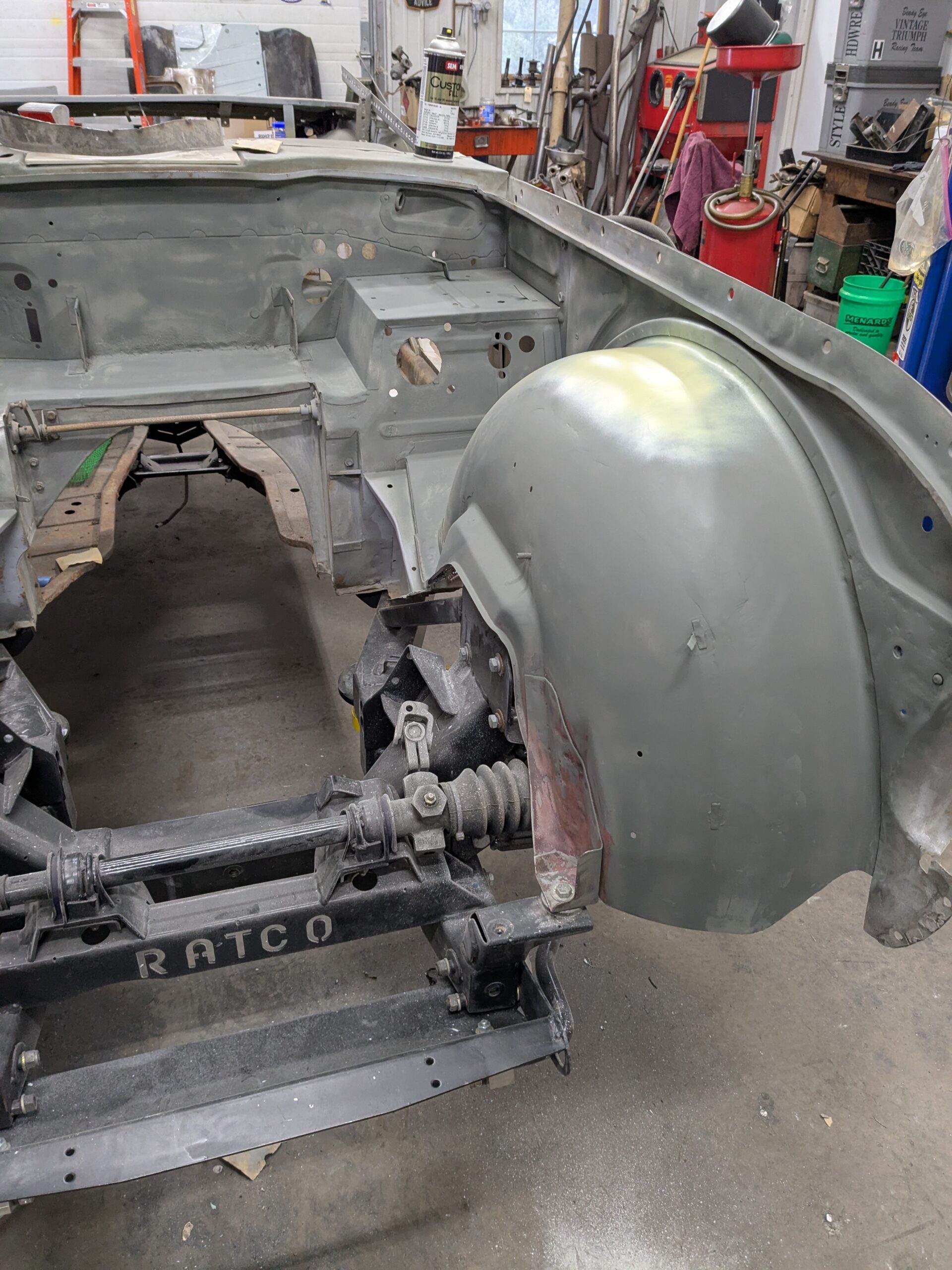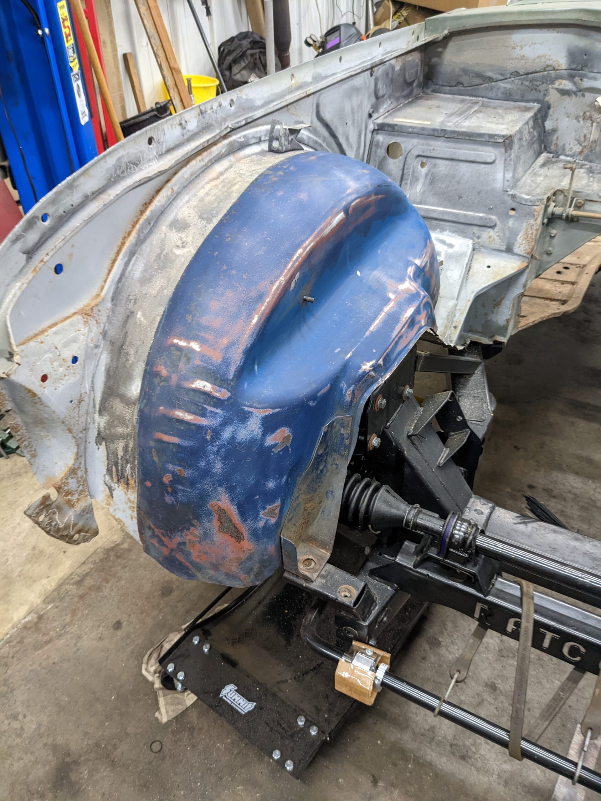 I decided it was time to test fit all 4 fenders and the doors, to see how the bits are going to line up. Turns out, not well at all. I question if the rear fenders I am working with are actual OEM, or used Heritage replacement fenders. I am thinking the latter.