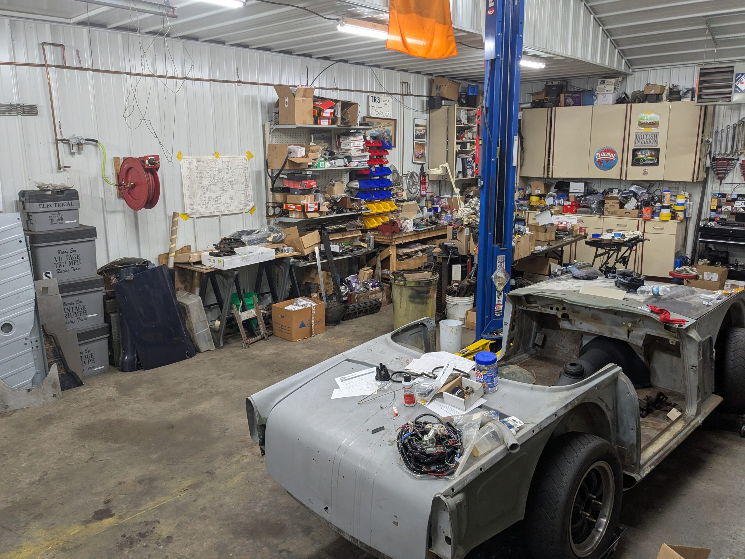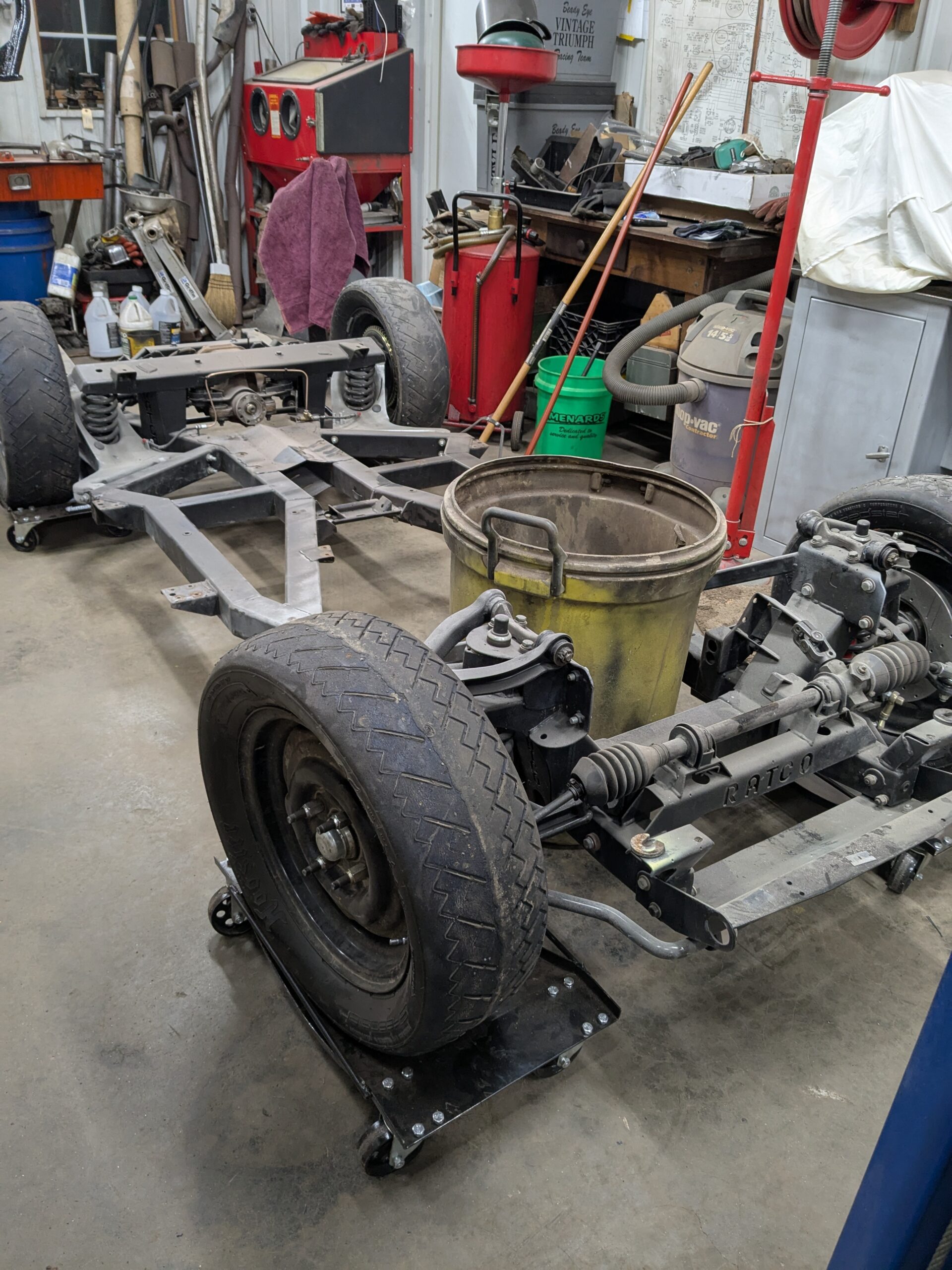 Jasmine will be the road going version of my TR250 racer. I am not trying to pull the wool over anybody’s eyes, I am not building trying to build a TR250. The car will look like a TR4A, but have TR6 running gear. My intent is to use as many good parts as I can that have been in my shop for far too long. Over the years I accumulated lots of race car bits, and I will be using as many of the extra spares I can. Built off a late TR6 2011 Ratco frame I bought in 2022 from the daughter of the guy who bought it and passed away having never put a bolt in it. Starting with a TR4A tub, the car will be powered by a rebuilt later TR6 engine, a rebuilt stock TR gearbox with a J-type overdrive, Goodparts rear end bits, and run on a set of Koenig 15X7 wheels in graphite. Koni’s up front, reworked lever shocks in the rear. TR6 pedal box with the booster and dual circuit brakes. HD front spindle kit with spacers to set wheel bearing preload, aluminum hubs. The dash will be TR4A with the large air vents. Seats to be determined, I am hoping I can make the Suffolk seats I have in stock fit. A late TR6 black interior kit, because I have one on the shelf. Soundproofing throughout, black carpet.