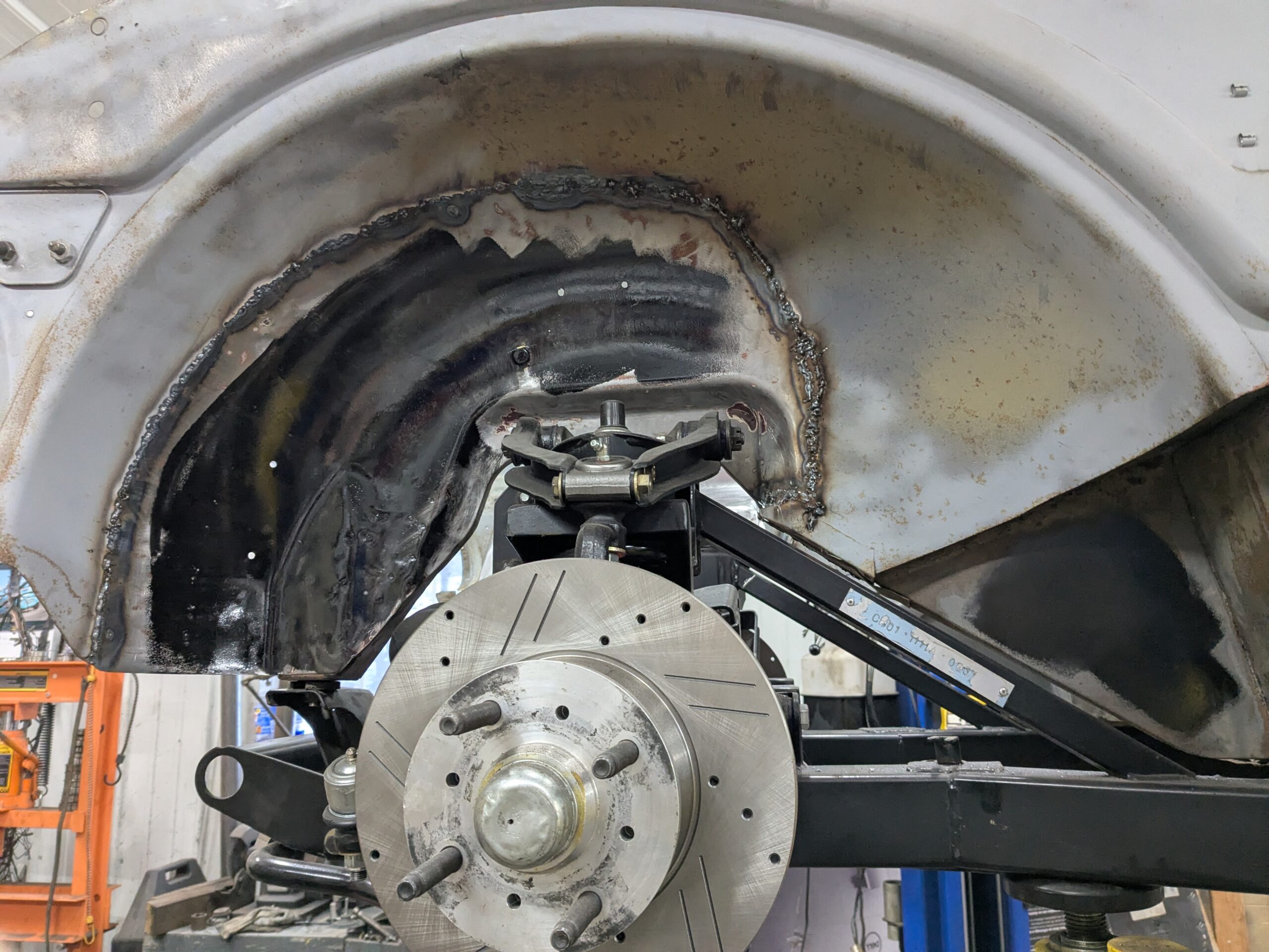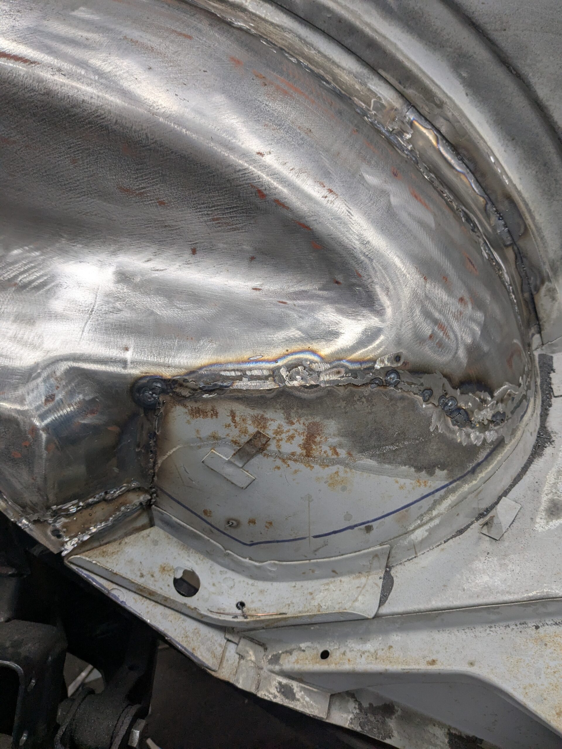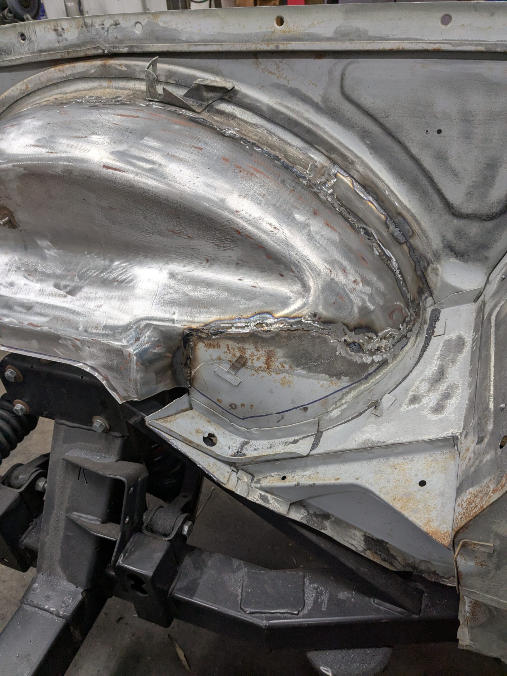 October-2025 – Back in March, 2025 I offered up the left rear fender found a problem. The flange that forms the inner fender was reworked and they didn’t get the bits lined up properly. The body line was 1/2″ too high at its highest point. Racing season was here, so I packed up the project and rolled it out of the way. After thinking about the problem during racing season and speaking to a friend with real bodywork skills about how to proceed, in October 2025 I decided to take a cut off wheel and slice out of the flange what needed to go, clamp down the inner fender to close the gap I just made and tack it down. Then refit the fender, see where I was, and repeat until I got the inner fender down to where it needed to be. While I was able to get the fender alignment pretty good, the very front of the fender is now a bit proud of the inner fender, see the last picture in this gallery.