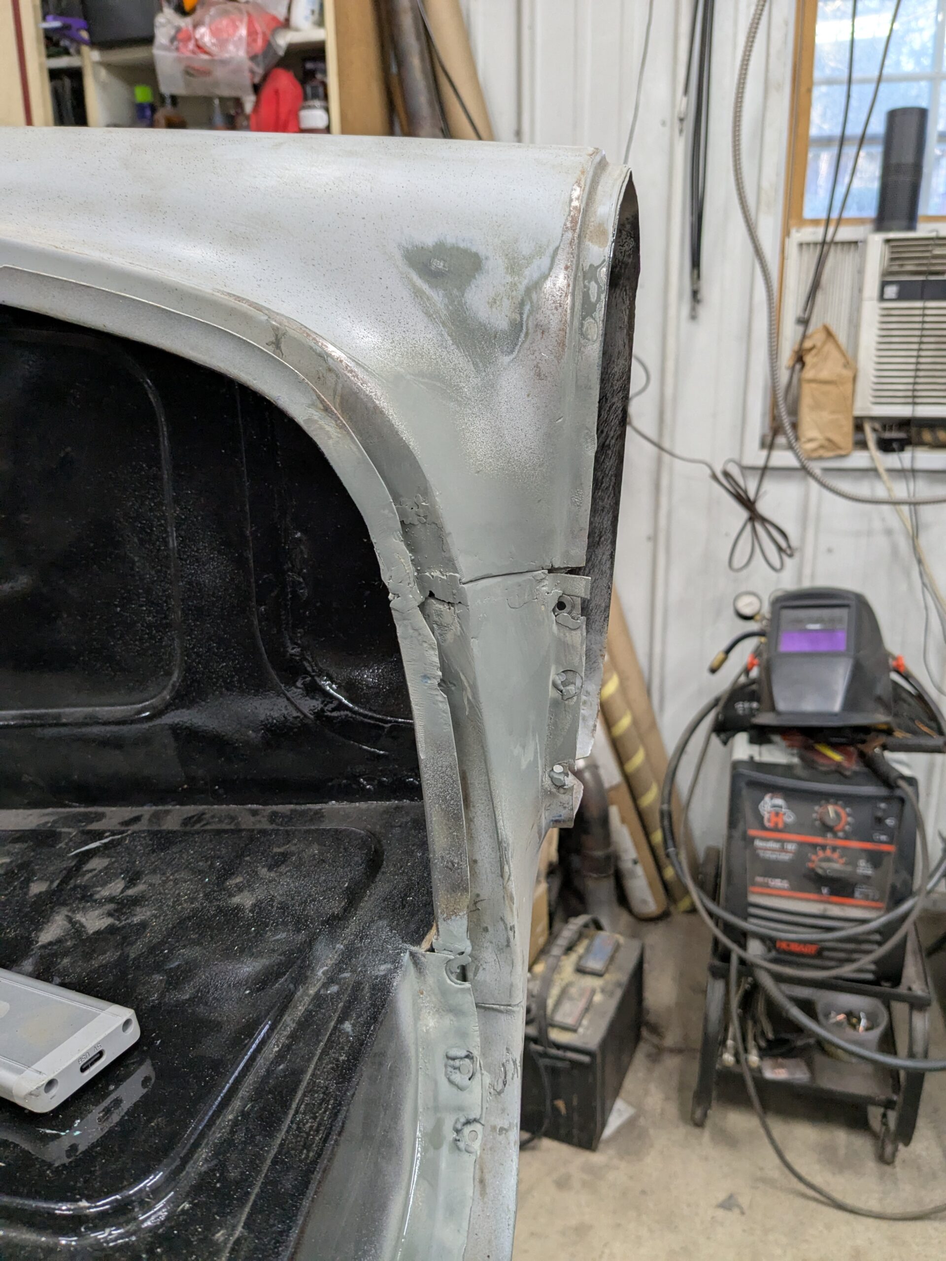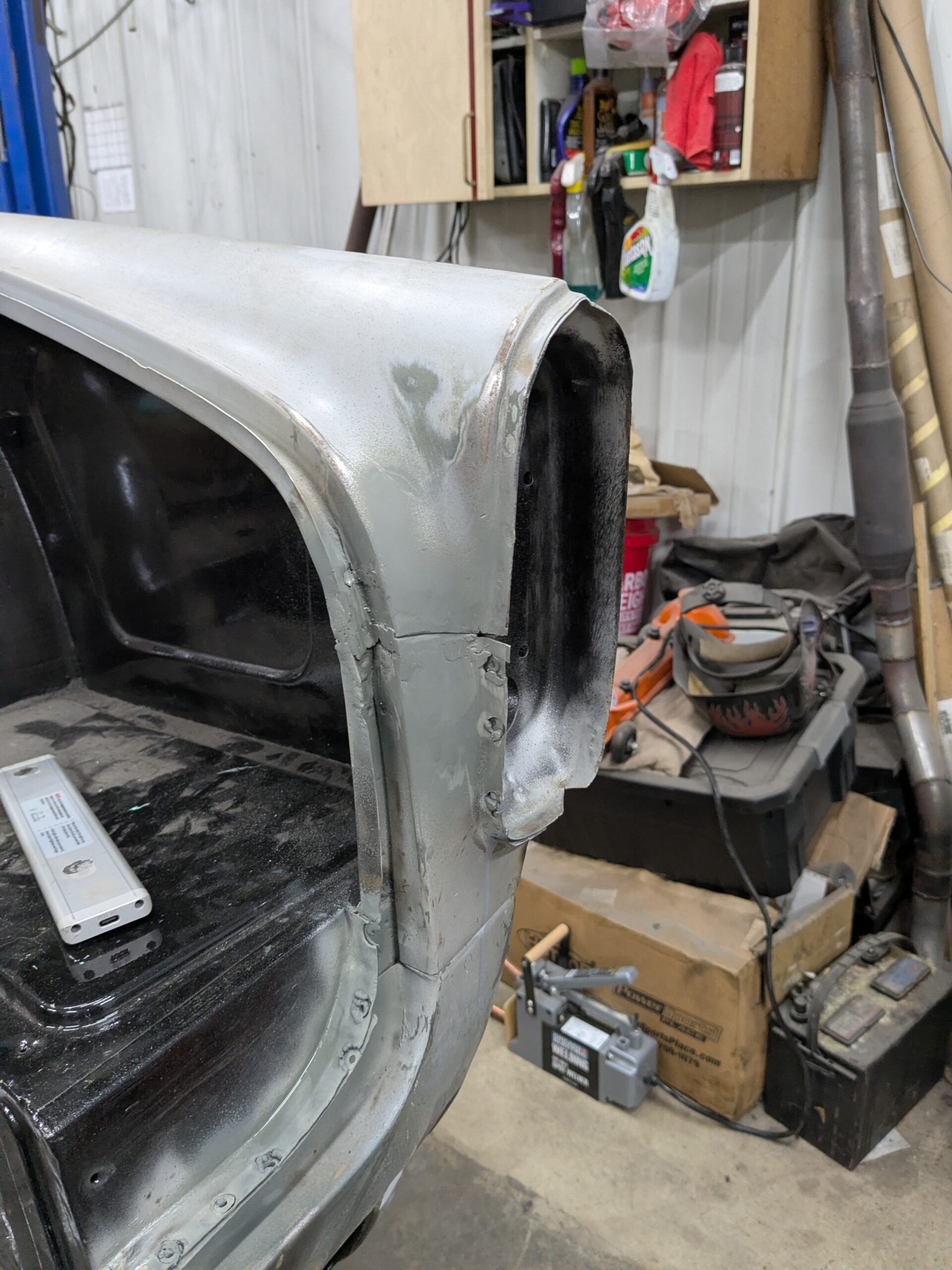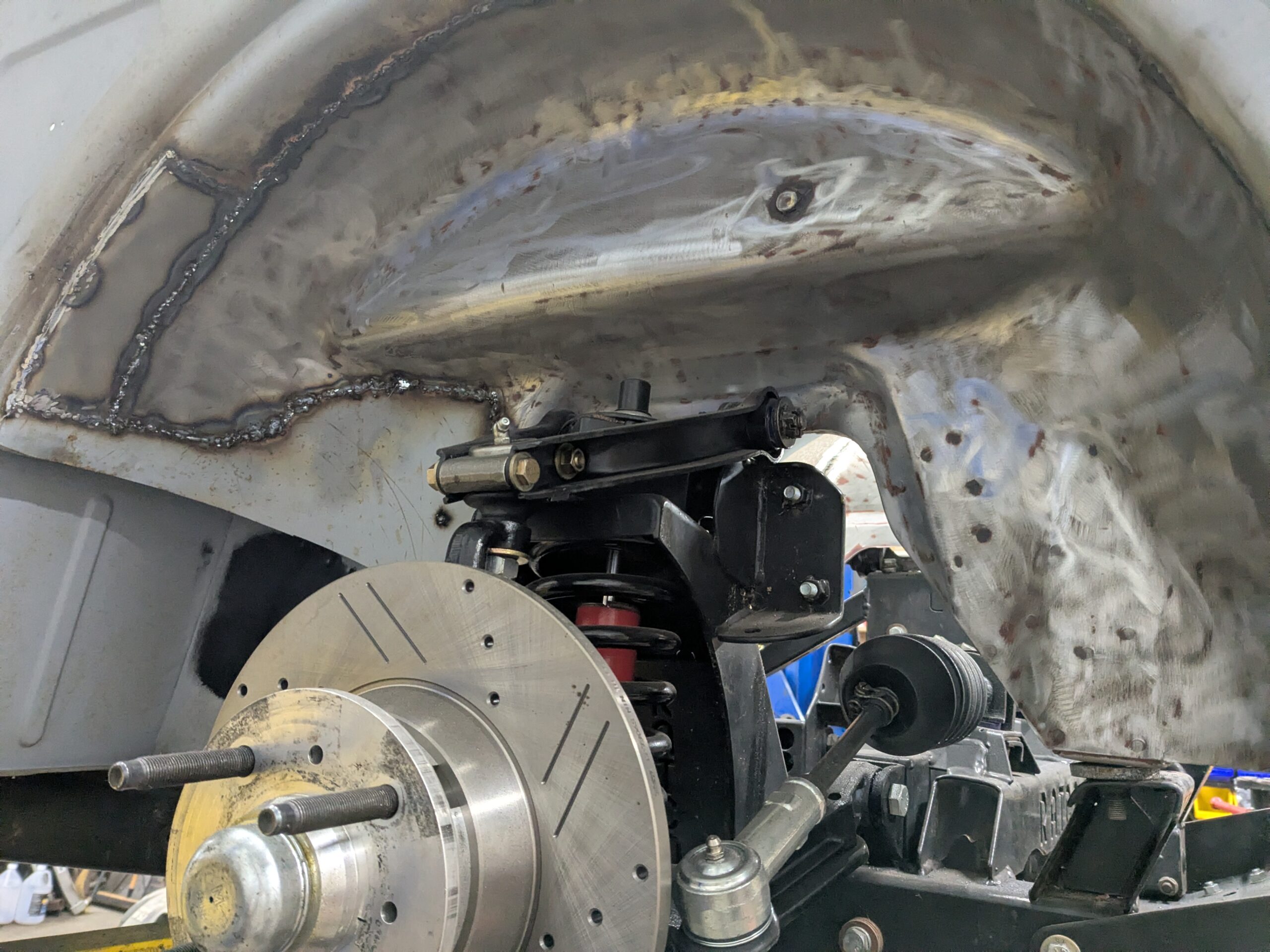 October-2025 – Back in March, 2025 I offered up the left rear fender found a problem. The flange that forms the inner fender was reworked and they didn’t get the bits lined up properly. The body line was 1/2″ too high at its highest point. Racing season was here, so I packed up the project and rolled it out of the way. After thinking about the problem during racing season and speaking to a friend with real bodywork skills about how to proceed, in October 2025 I decided to take a cut off wheel and slice out of the flange what needed to go, clamp down the inner fender to close the gap I just made and tack it down. Then refit the fender, see where I was, and repeat until I got the inner fender down to where it needed to be. While I was able to get the fender alignment pretty good, the very front of the fender is now a bit proud of the inner fender, see the last picture in this gallery.