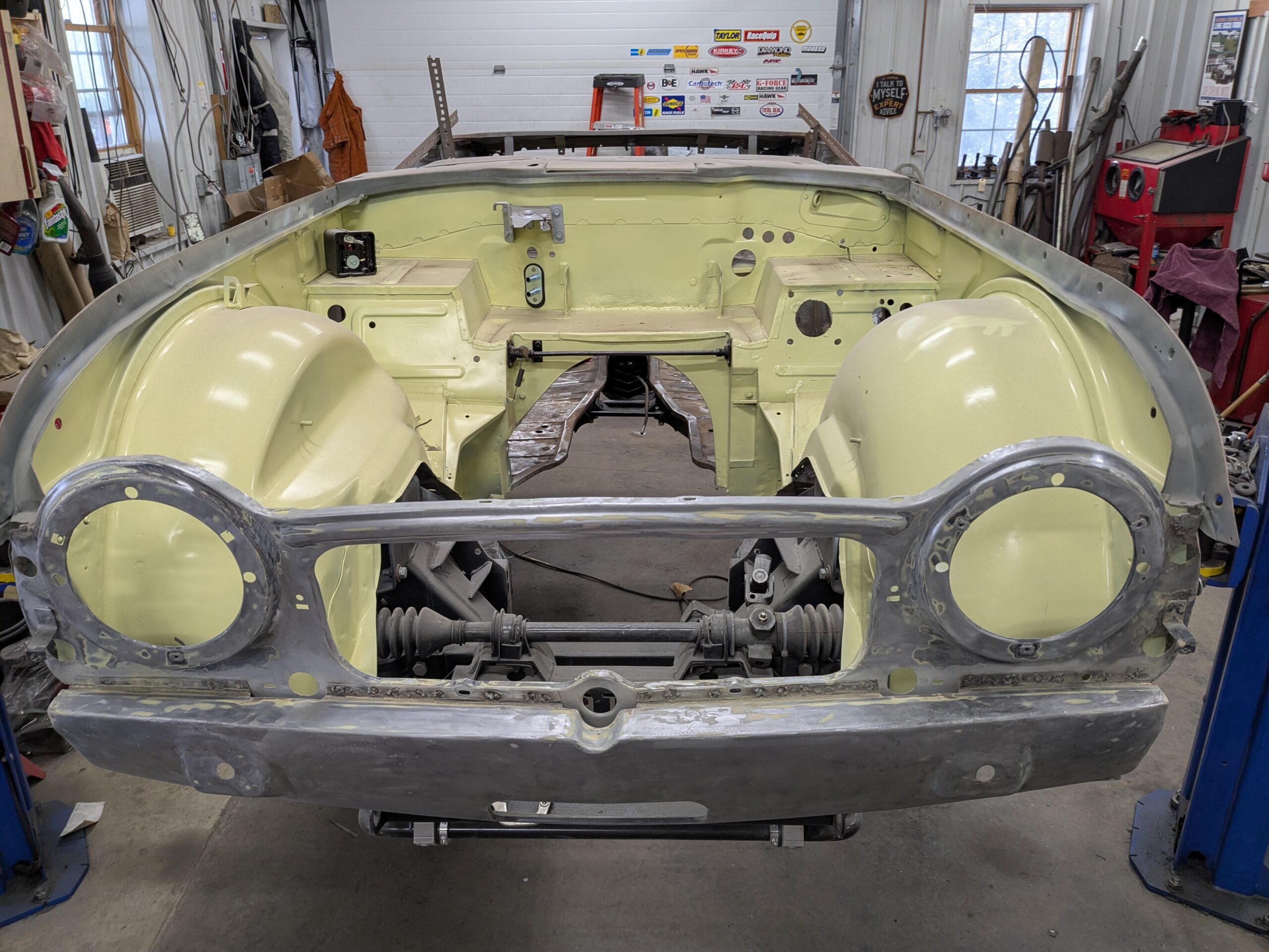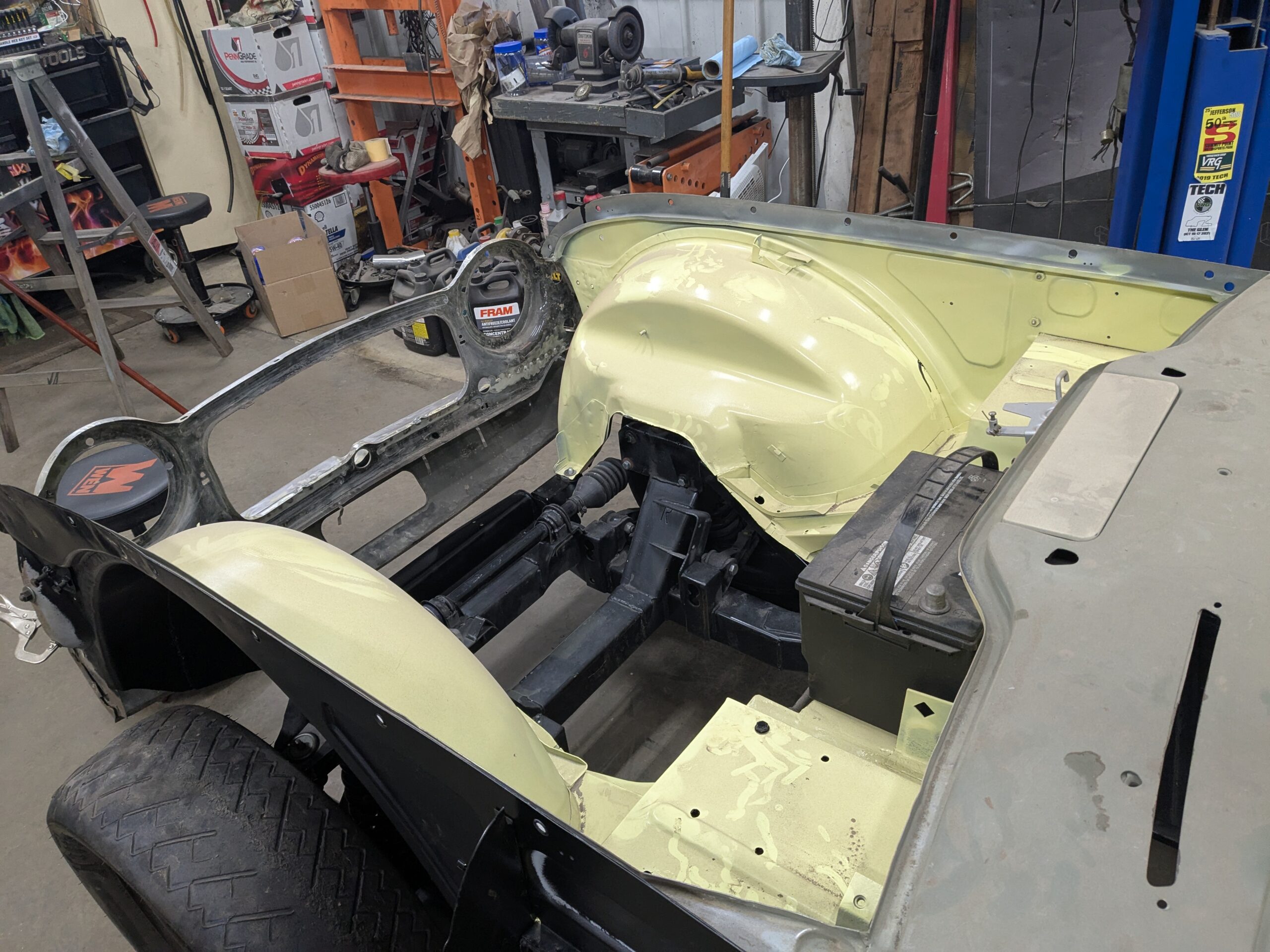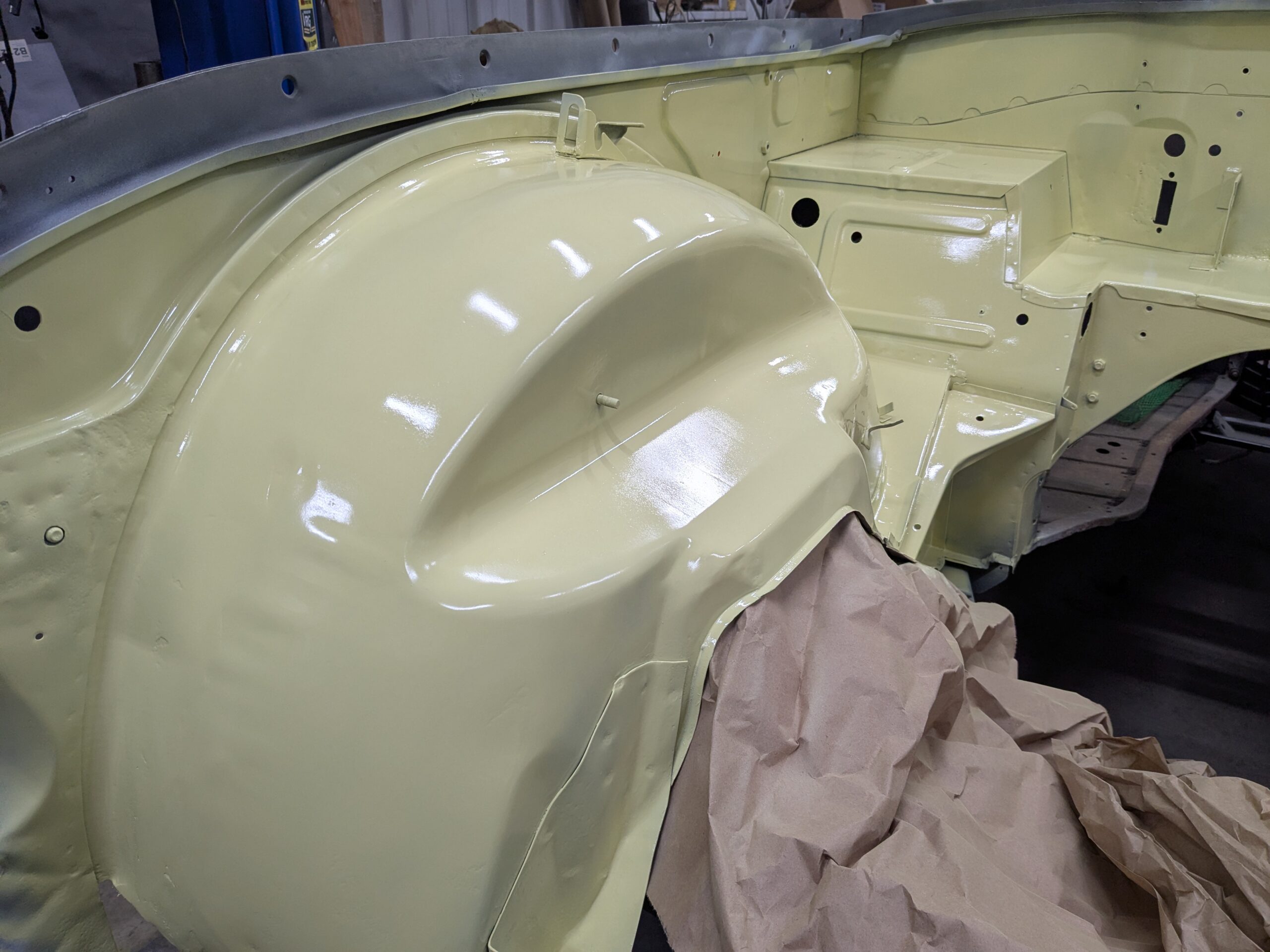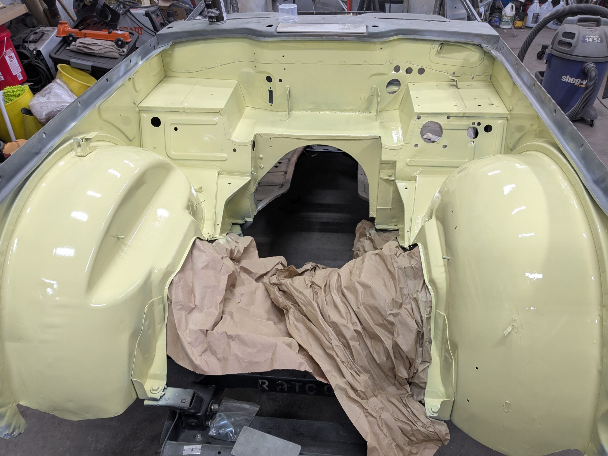 The engine compartment – The TR4A has a bunch of structure that would be unnecessary with the 6 cylinder engine, so I spliced in a pair of TR6 inner fenders. I shot the engine compartment with Jasmine paint I had made up at my local Napa, I brought in a couple of Jasmine paint codes and they had one of them in their system. I was able to get a big rattle can mixed for $40. I am pleased with the color. Work took place late 2024, through January, 2025.