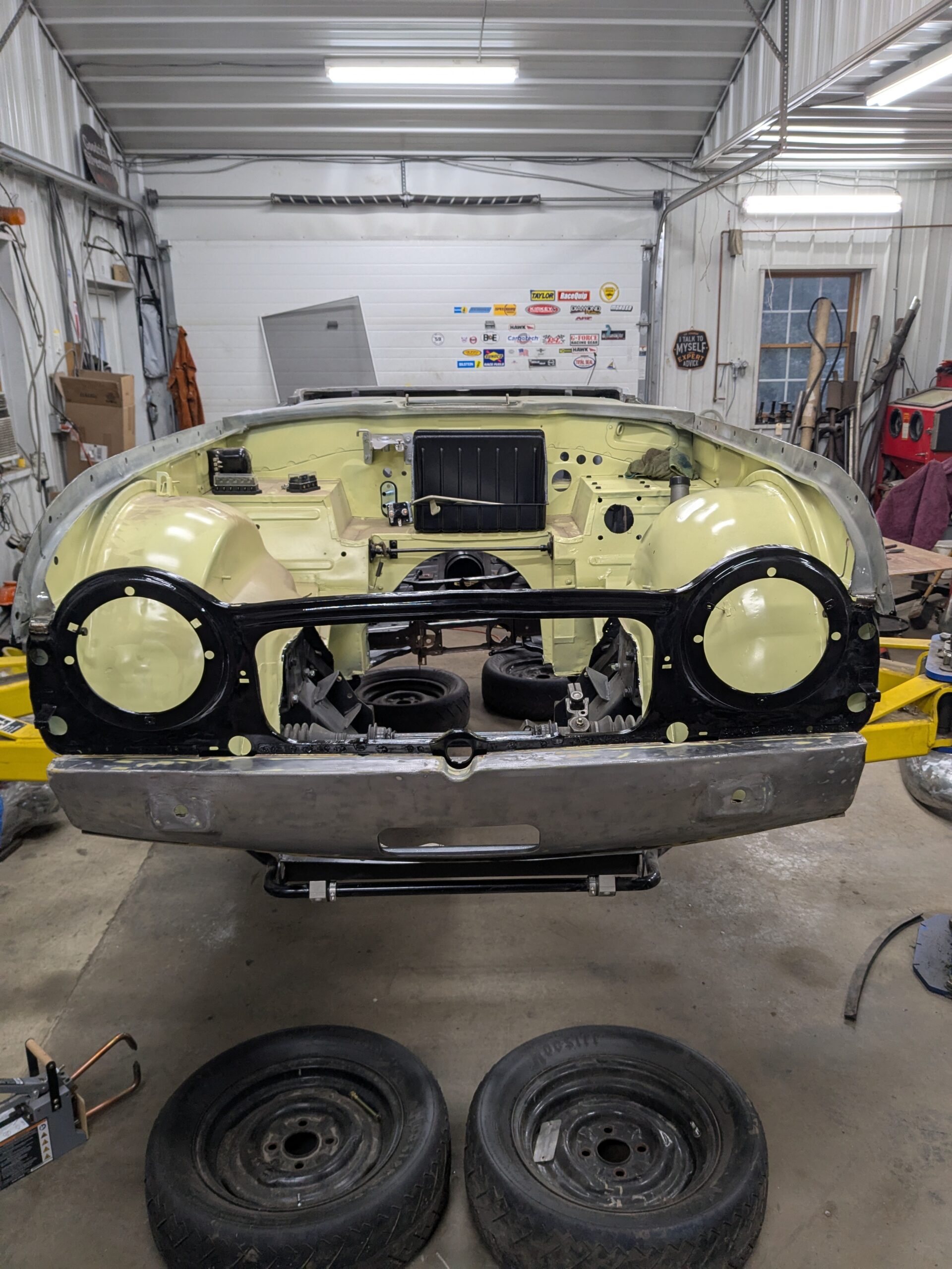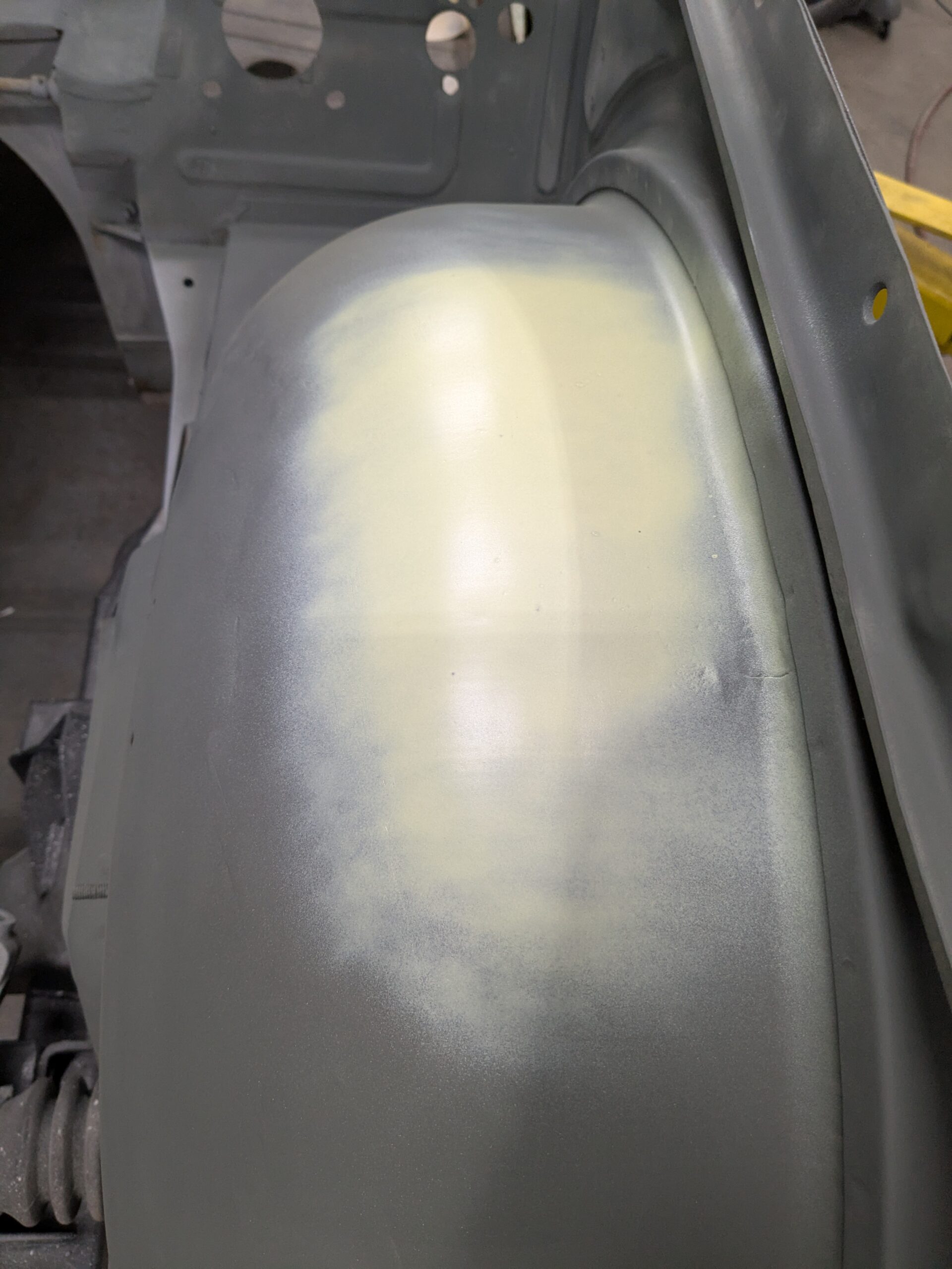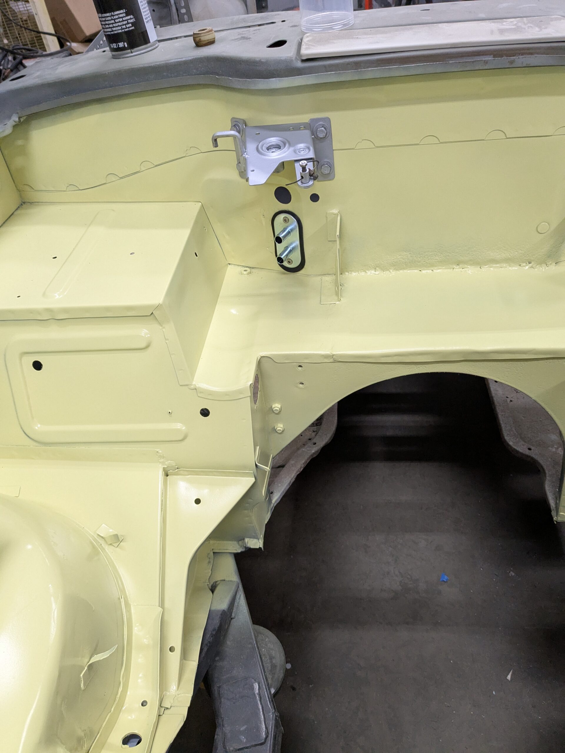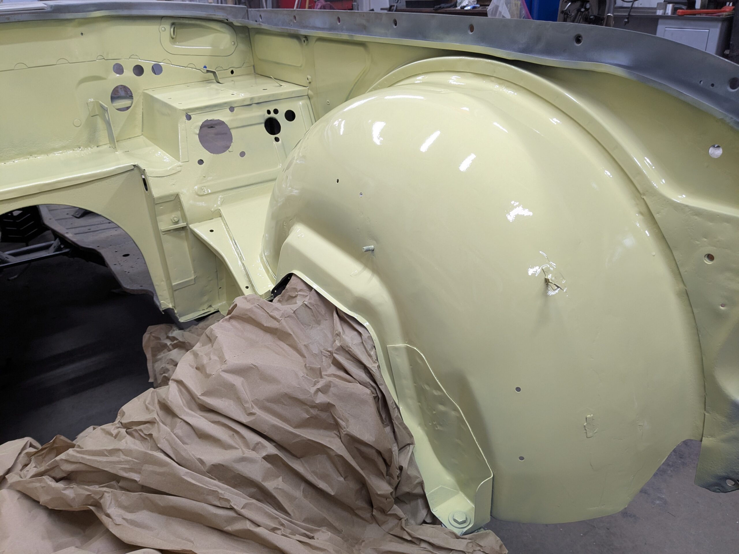The engine compartment – The TR4A has a bunch of structure that would be unnecessary with the 6 cylinder engine, so I spliced in a pair of TR6 inner fenders. I shot the engine compartment with Jasmine paint I had made up at my local Napa, I brought in a couple of Jasmine paint codes and they had one of them in their system. I was able to get a big rattle can mixed for $40. I am pleased with the color. Work took place late 2024, through January, 2025.