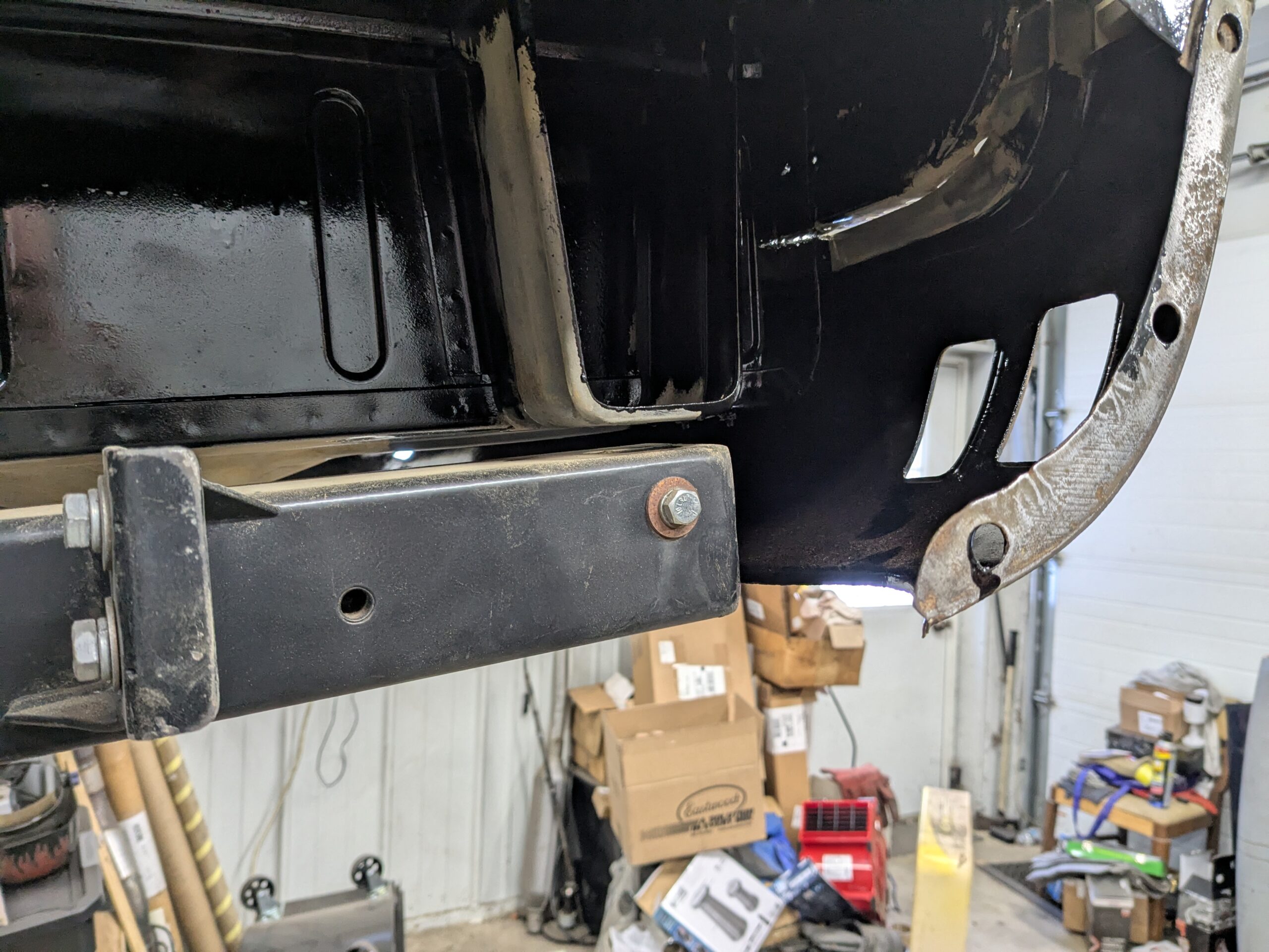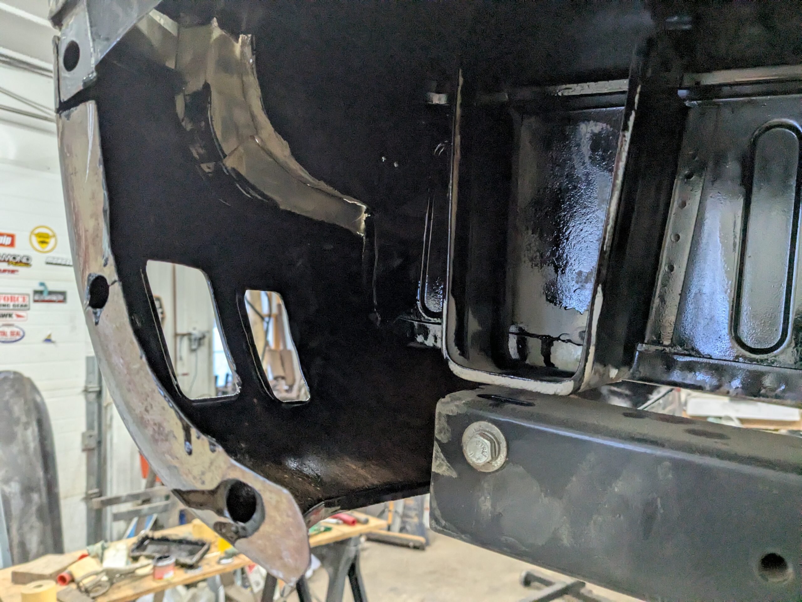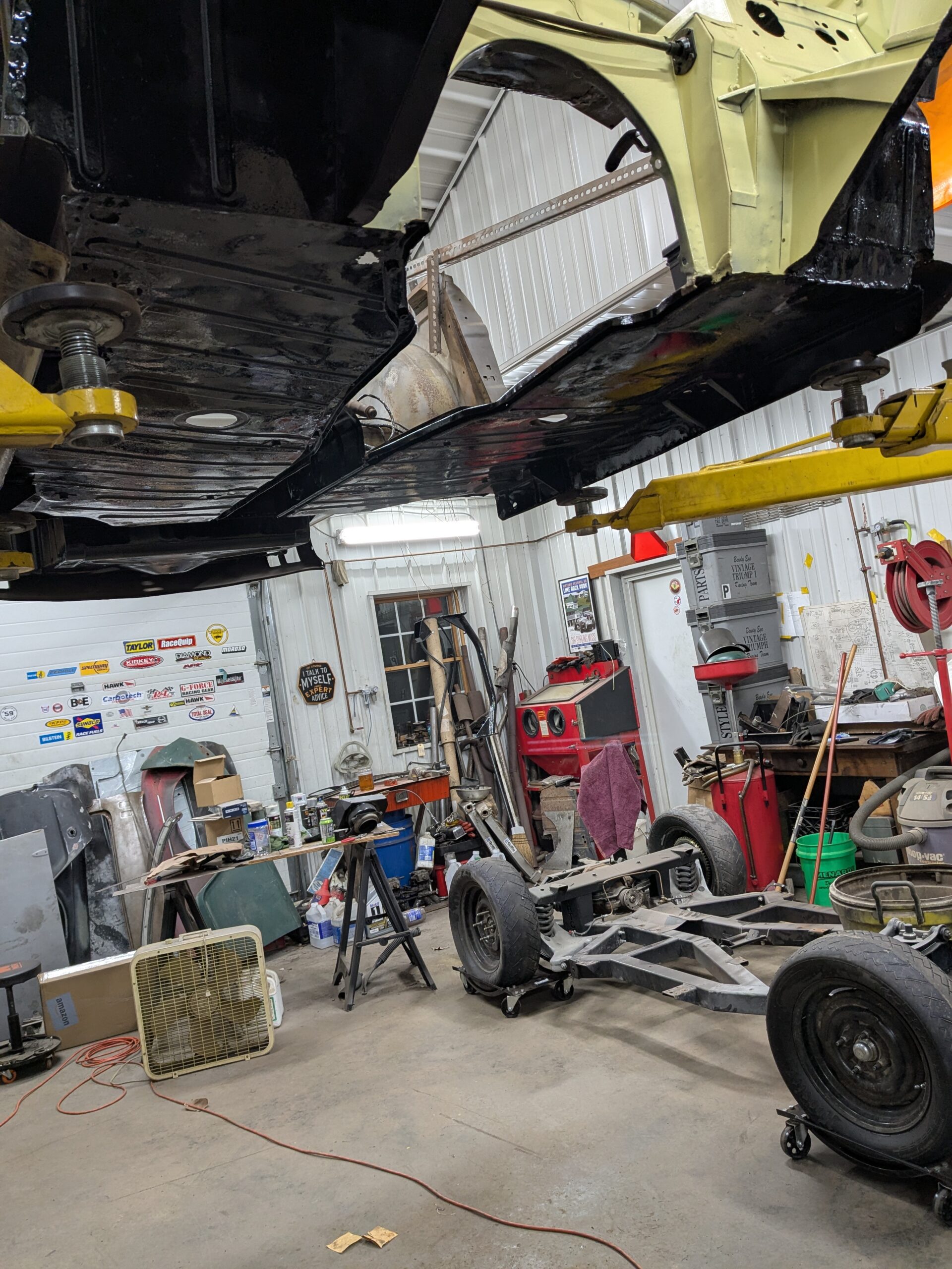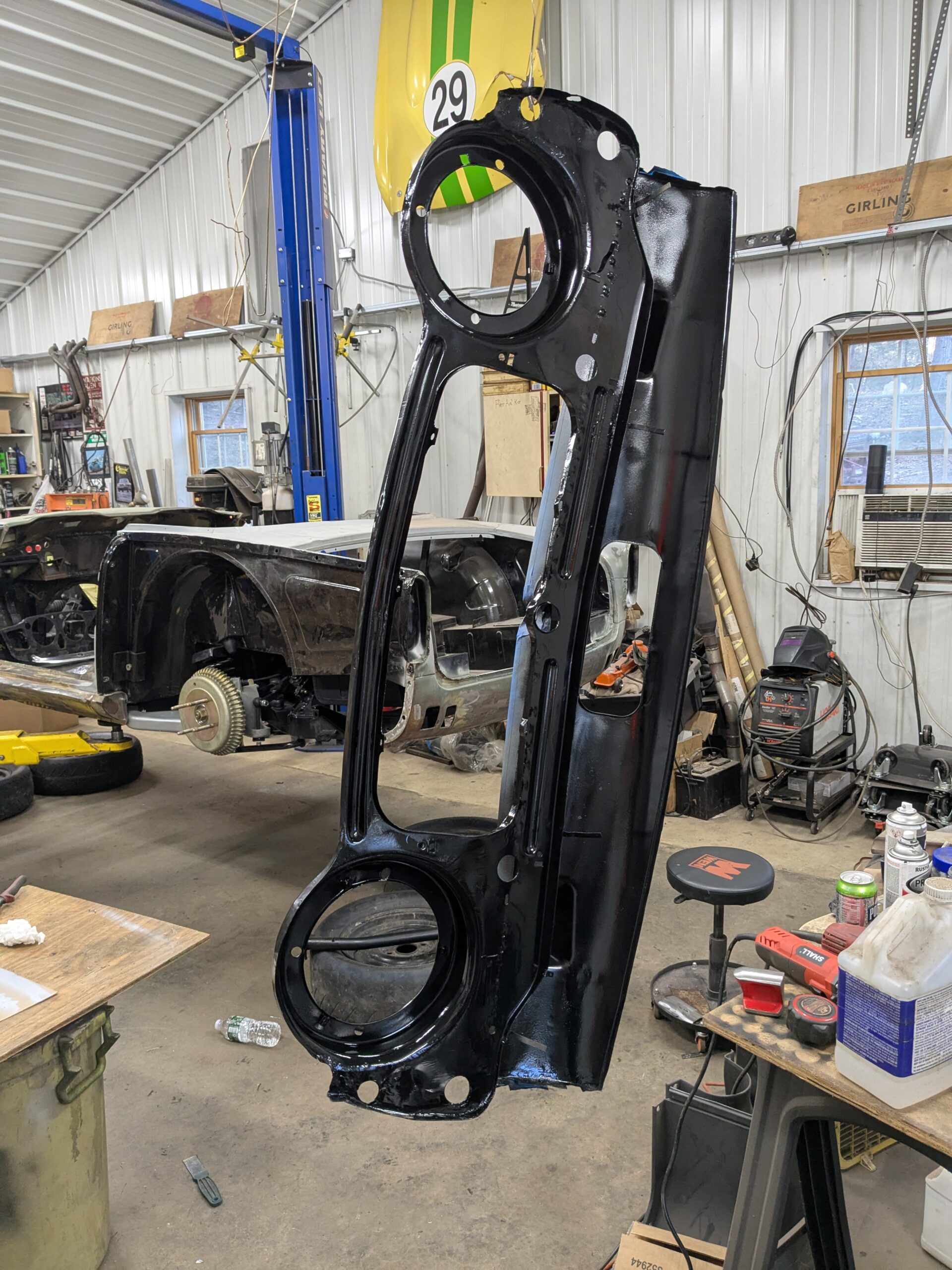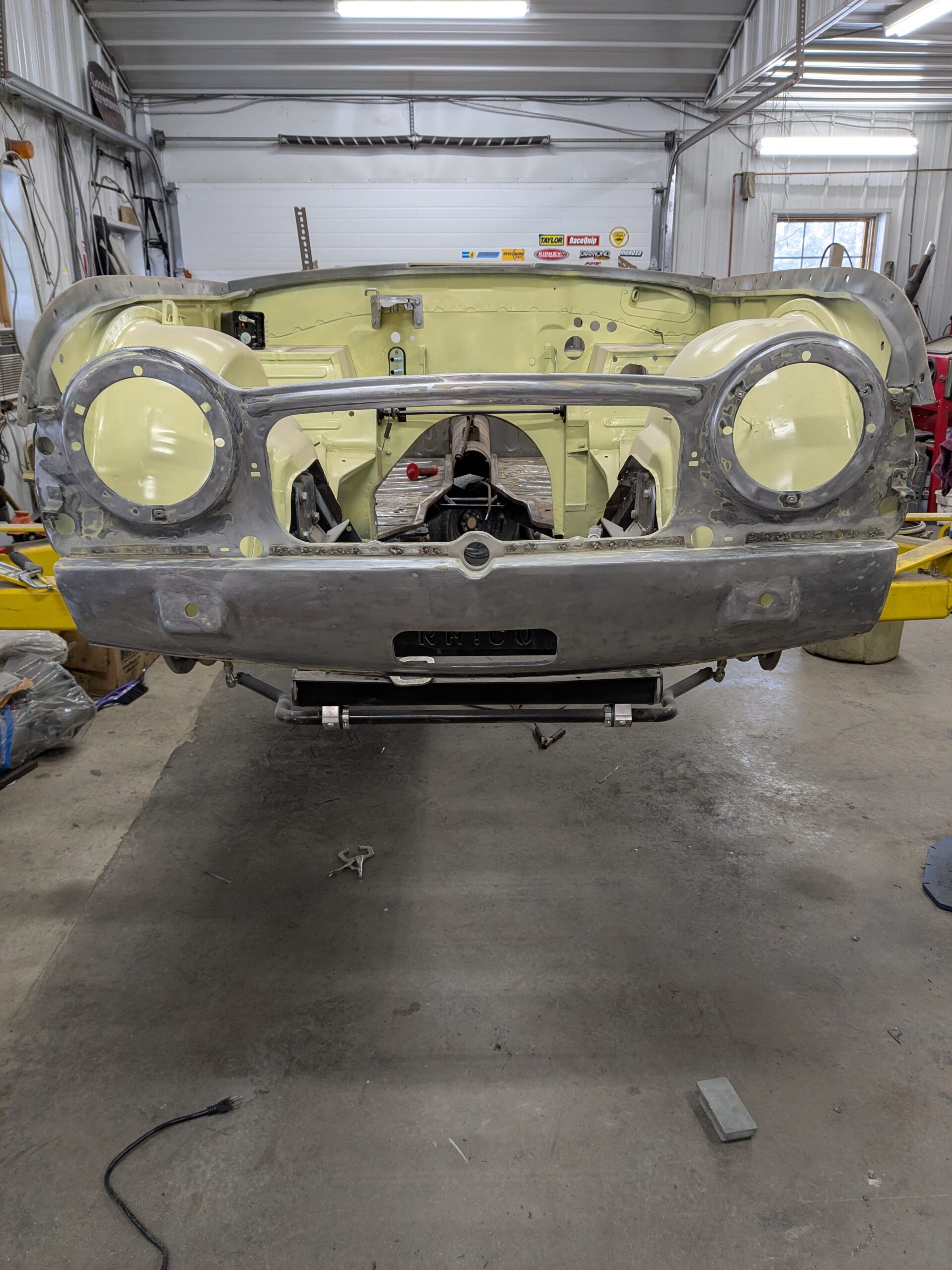 The engine compartment – The TR4A has a bunch of structure that would be unnecessary with the 6 cylinder engine, so I spliced in a pair of TR6 inner fenders. I shot the engine compartment with Jasmine paint I had made up at my local Napa, I brought in a couple of Jasmine paint codes and they had one of them in their system. I was able to get a big rattle can mixed for $40. I am pleased with the color. Work took place late 2024, through January, 2025.