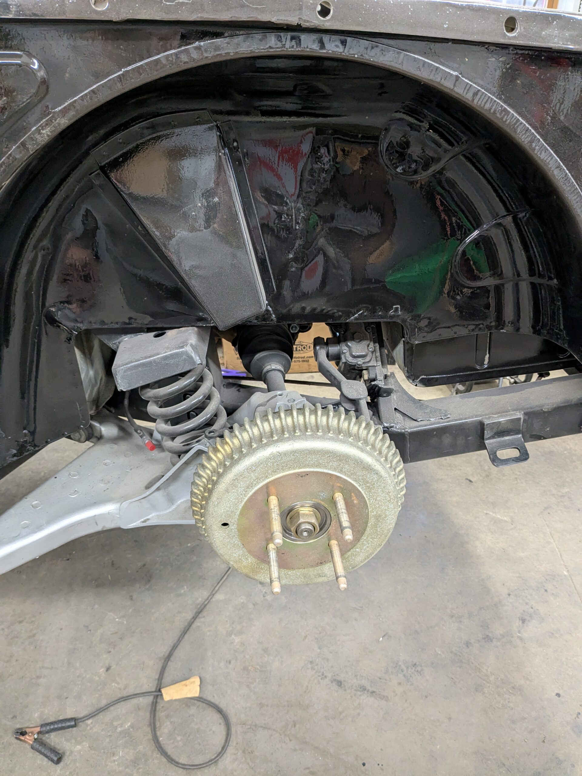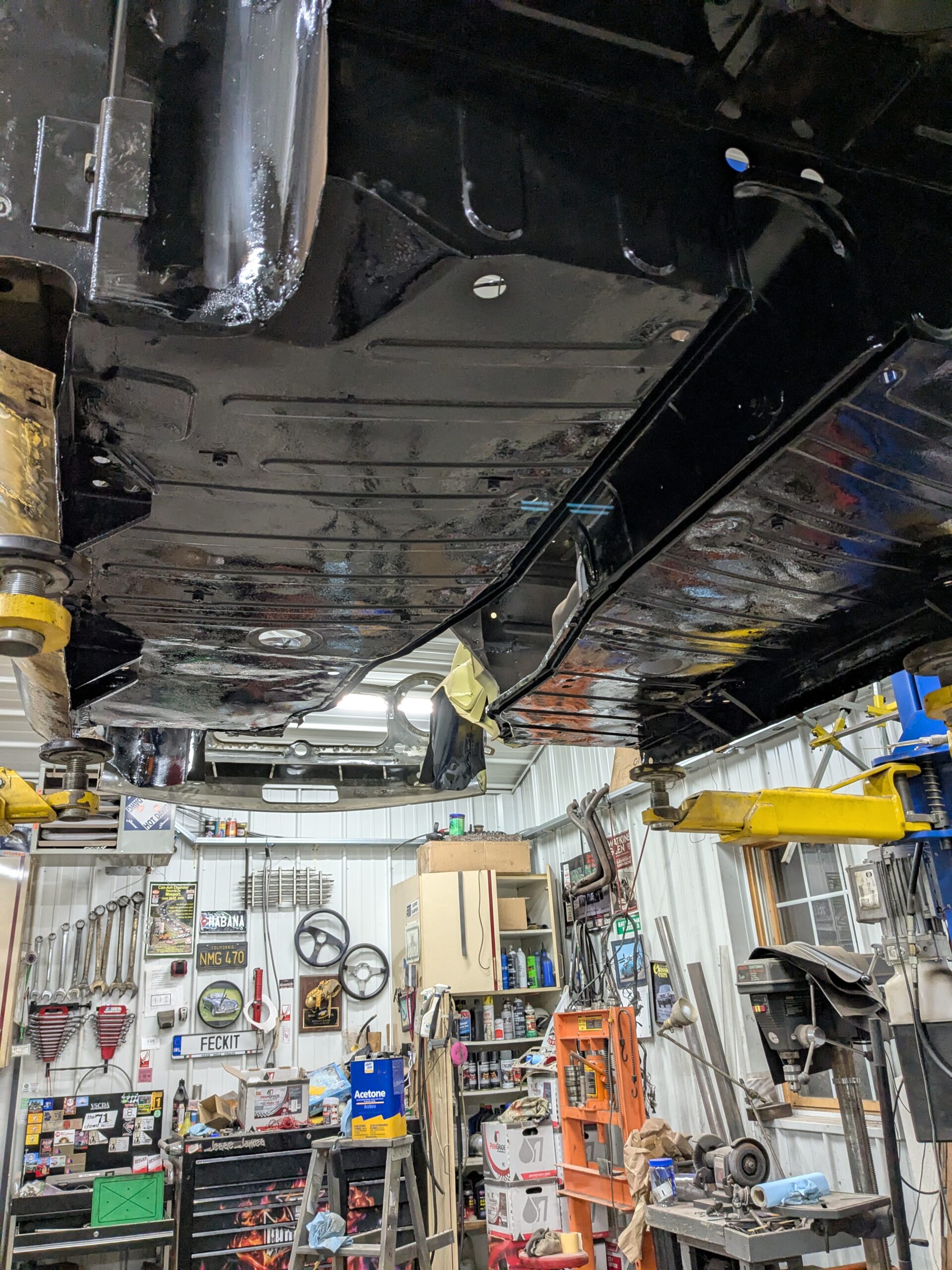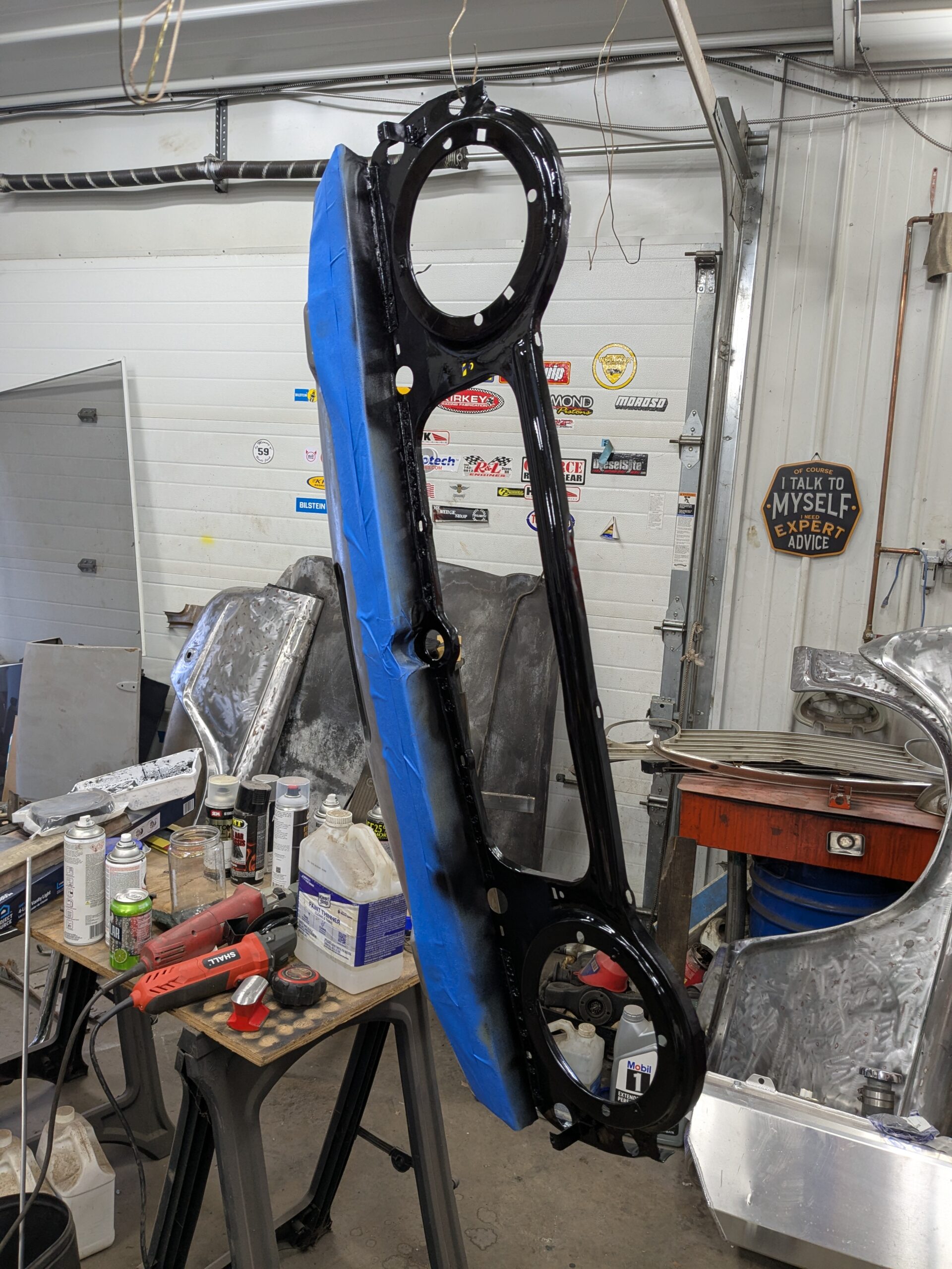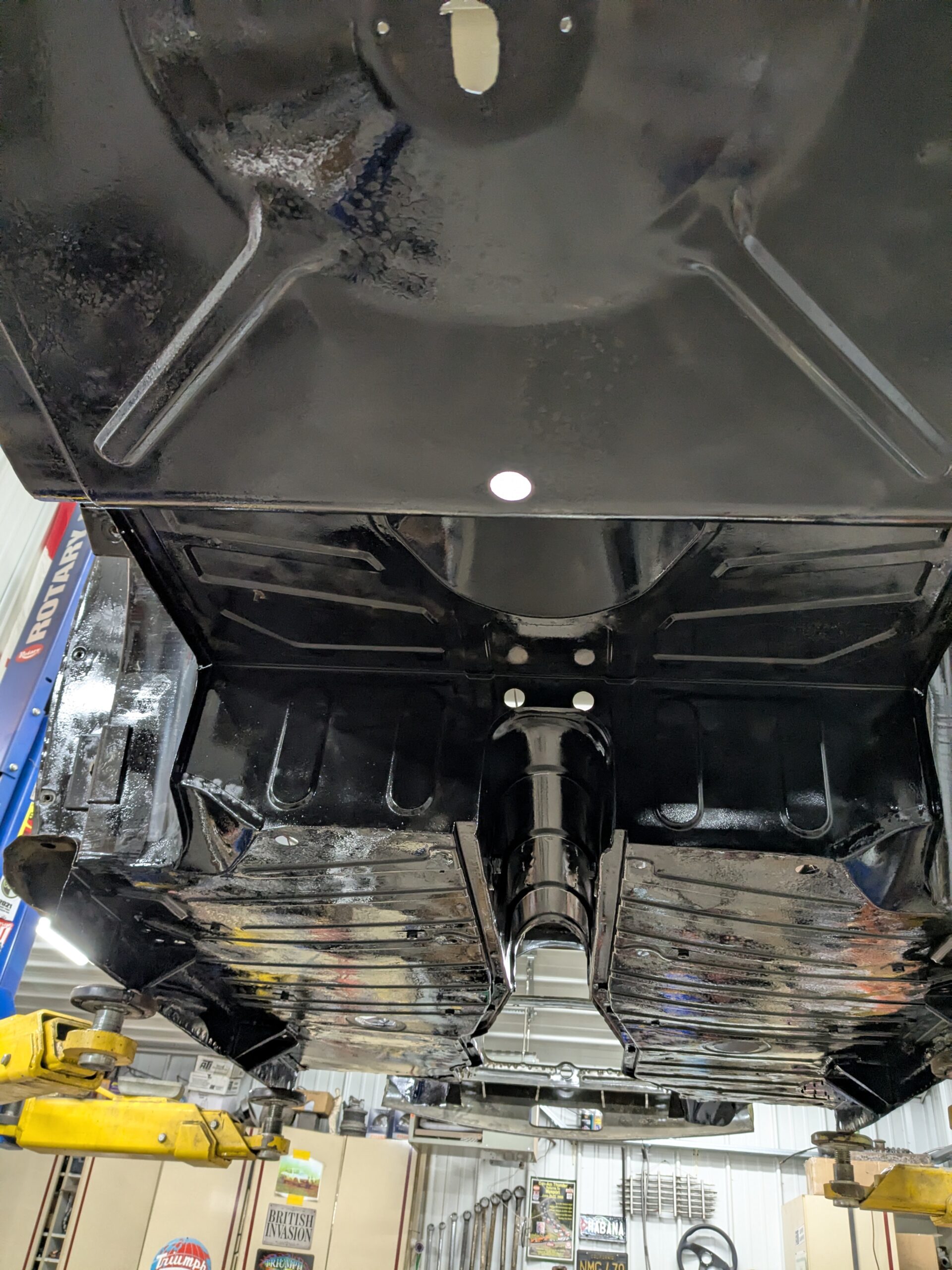 The engine compartment – The TR4A has a bunch of structure that would be unnecessary with the 6 cylinder engine, so I spliced in a pair of TR6 inner fenders. I shot the engine compartment with Jasmine paint I had made up at my local Napa, I brought in a couple of Jasmine paint codes and they had one of them in their system. I was able to get a big rattle can mixed for $40. I am pleased with the color. Work took place late 2024, through January, 2025.