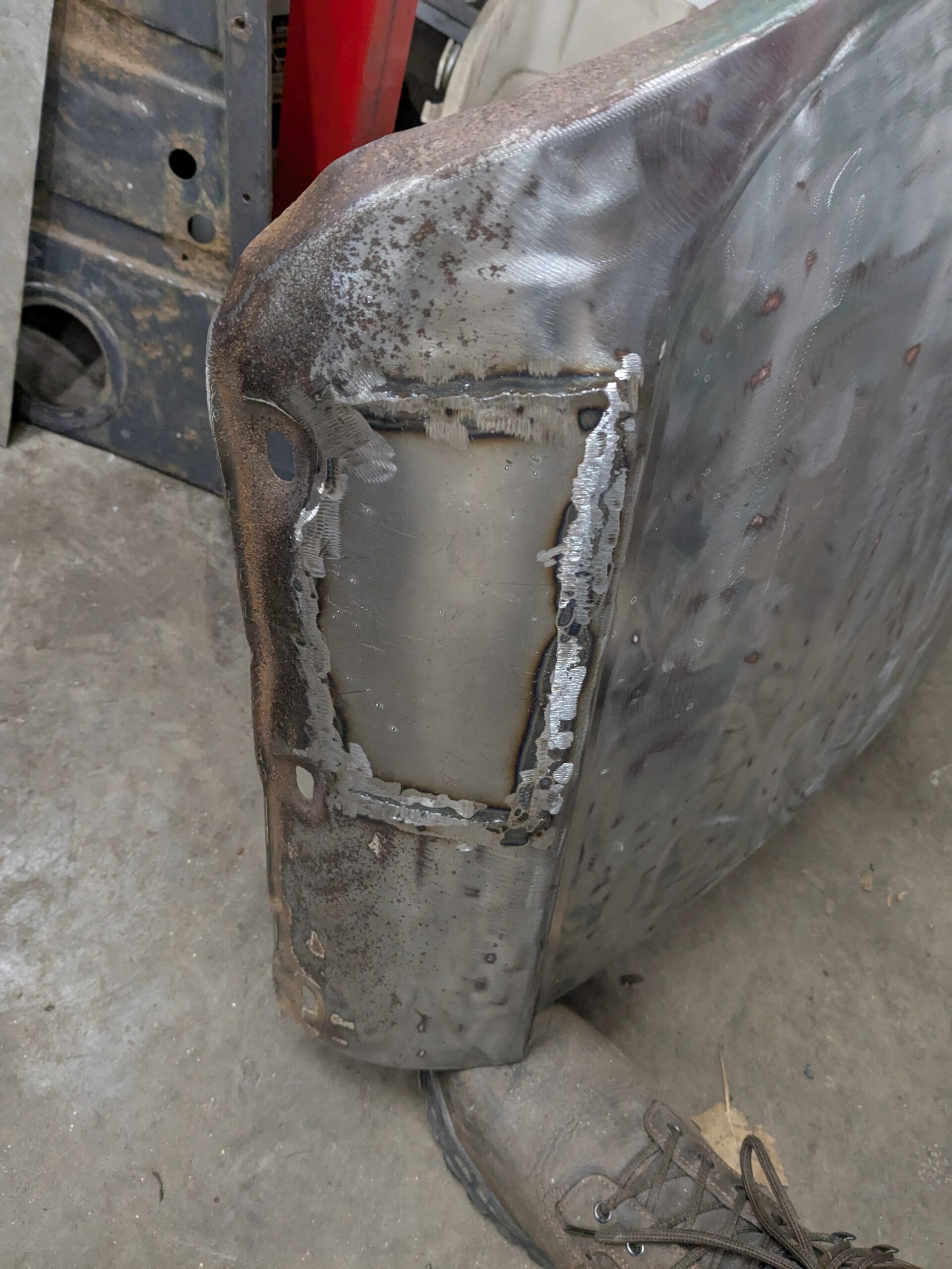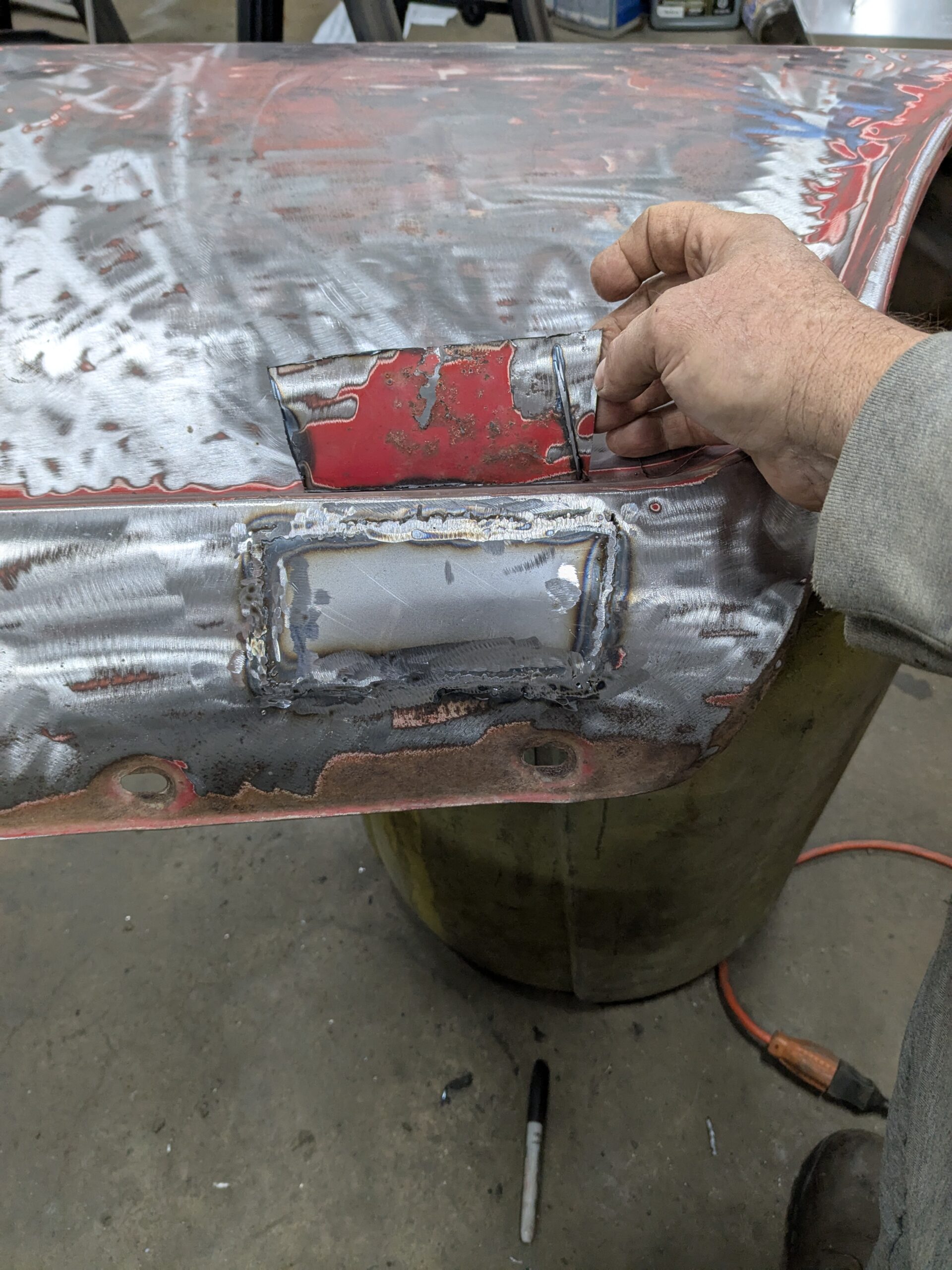 So what’s going on here? It appears the fender I was using was not built right. The fender design has a flange welded into the forward edge that nests against and bolts to the back of the B-post. That flange runs almost top to bottom of the fender, and when it sat in position, the fender was about 1/4 inch too far rearward. The next fender I tried fit perfectly in that respect. This other fender is actually not bad, so I removed the undercoating and didn’t find any additional issues, it only needs one repair, on the leading edge behind the door gap. I cut out the bad metal, and fabricated the patch.