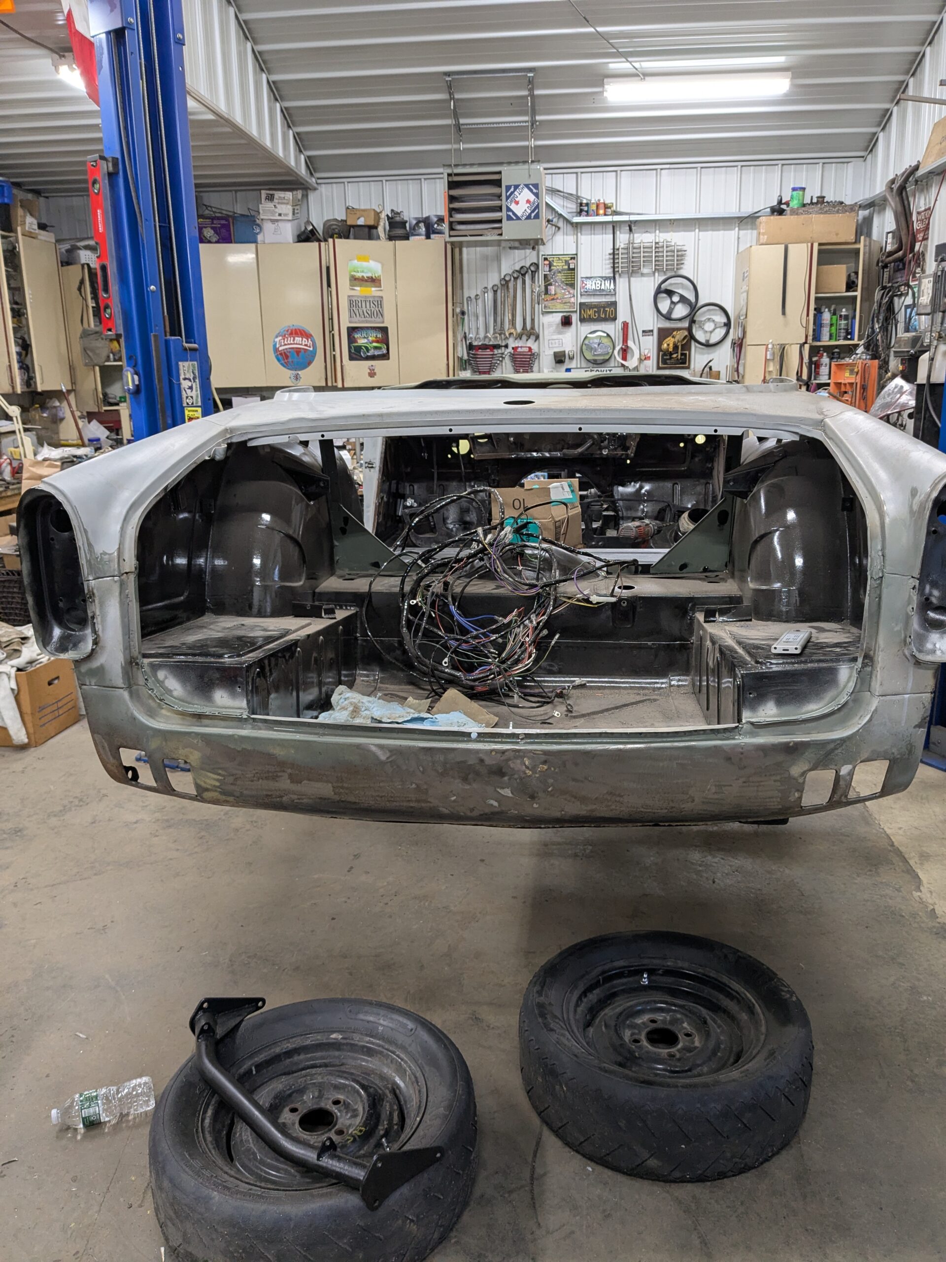 10-17-25 – While I was stewing on the rear fender issue, I decided it was time to test fit all the body panels. I pulled out a pair of boot deck hinges and installed the boot. The only issue is the bottom edge of the boot lid seems like it was pushed in at the centerline of the car. I gave it quick pull and did get better. The boot lid fit around the fenders and front edge is good, this will take a little more tweaking but will be good.